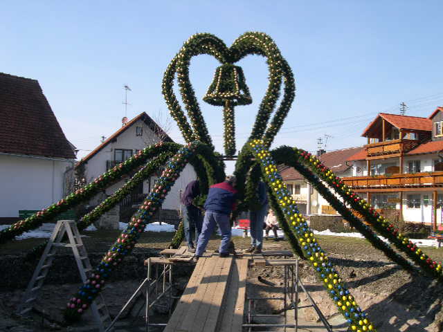 In Bieberbach hat bereits seit langem die Ostersaison begonnen. Der größte Osterbrunnen der Welt wird seit Mittwoch geschmückt. Den ganzen Winter hindurch wurden immer noch ca. 500 Ostereier, die zum Beispiel durch Bruch ersetzt werden müssen, bemalt. Aber auch jedes Jahr verändert sich das Aussehen und neuer Osterschmuck muss gefertigt werden. Seit 1982 wird der Osterbrunnen in Bieberbach geschmückt. Besuchen Sie doch jetzt schon am Palmsonntag den Osterbrunnen live in Bieberbach oder einige Bilder vom Osterbrunnenschmücken unter: www.Osterbrunnen.de